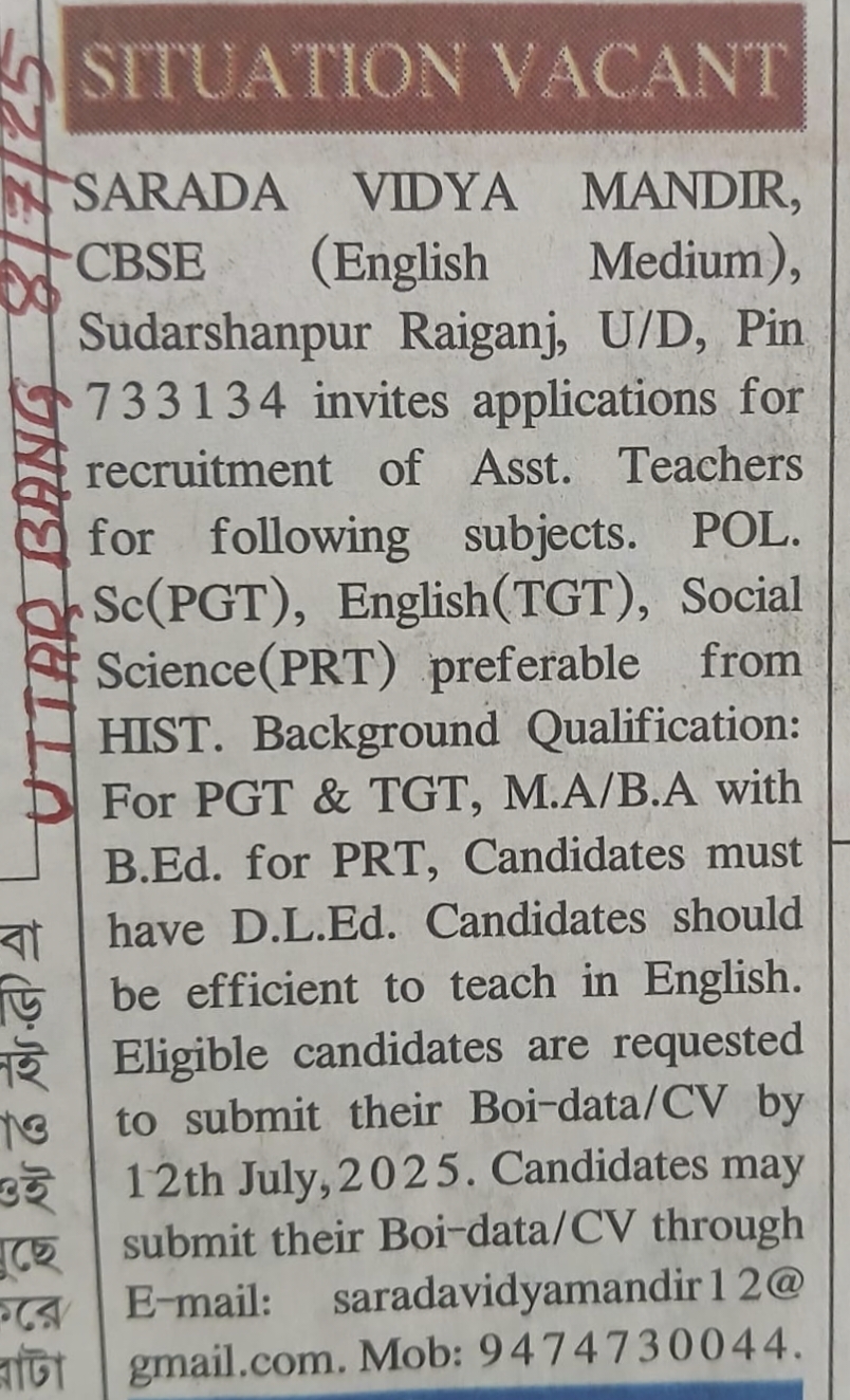 Sarada Vidya Mandir located in Sudarshanpur Raiganj Uttar Dinajpur West Bengal is a Co-Educational Senior Secondary institution affiliated to the Central Board of Secondary Education (CBSE)  since 1995.